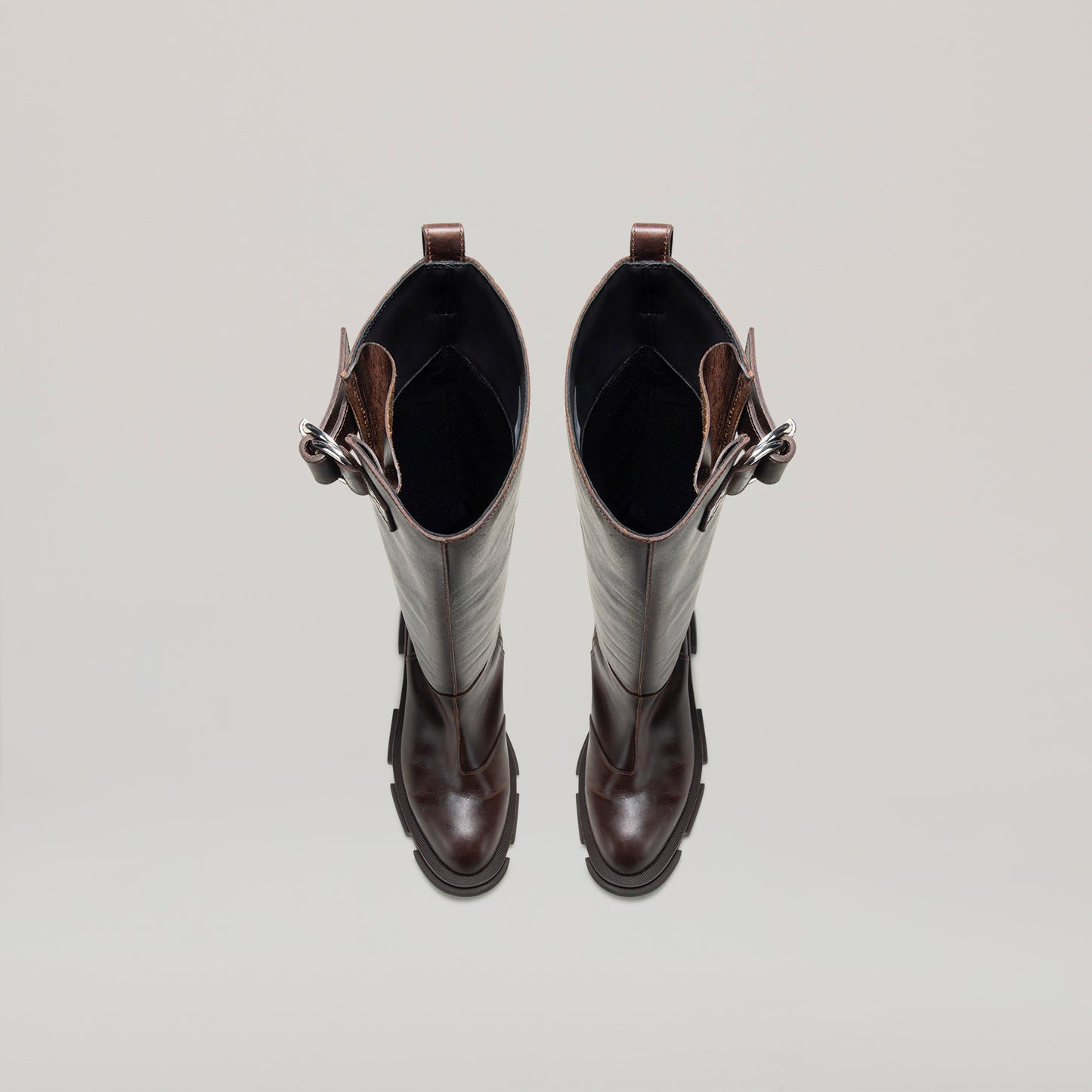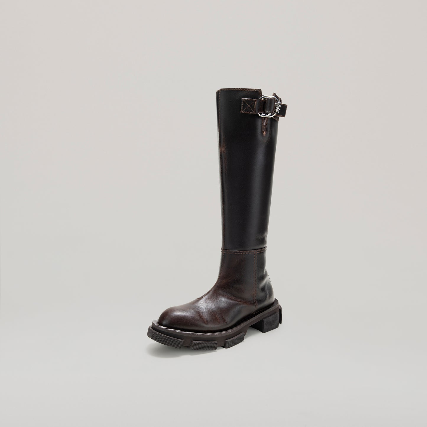 Elevate your wardrobe with the sleek and edgy GAO PIERCED KNEE BOOT in Brown. With a striking silver ring and signature outsole, these boots make a statement while providing comfort and style. Perfect for any occasion or outfit, these boots are a must-have for any fashion-forward individual.