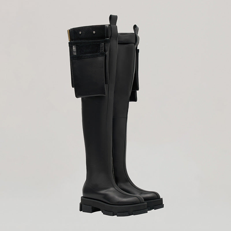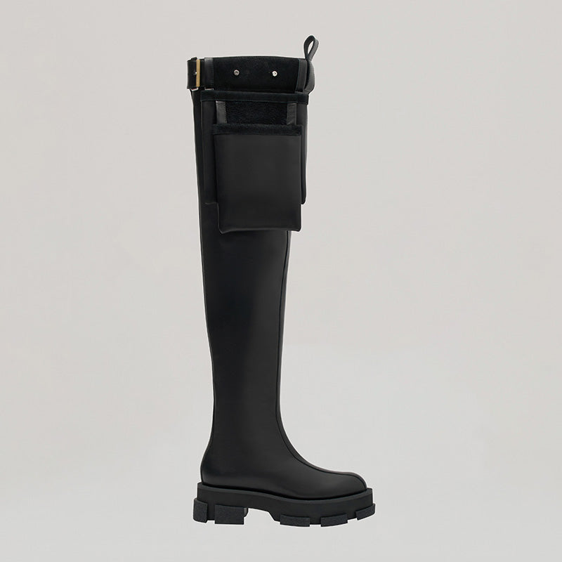 both x DION LEE-GAO PLATFORM THIGH-HIGH BOOT WITH TOOLBELT-BLACK. These boots are more than just a fashion statement - the platform adds height and the toolbelt detail adds a touch of functionality. Perfect for the daring and playful fashionista!