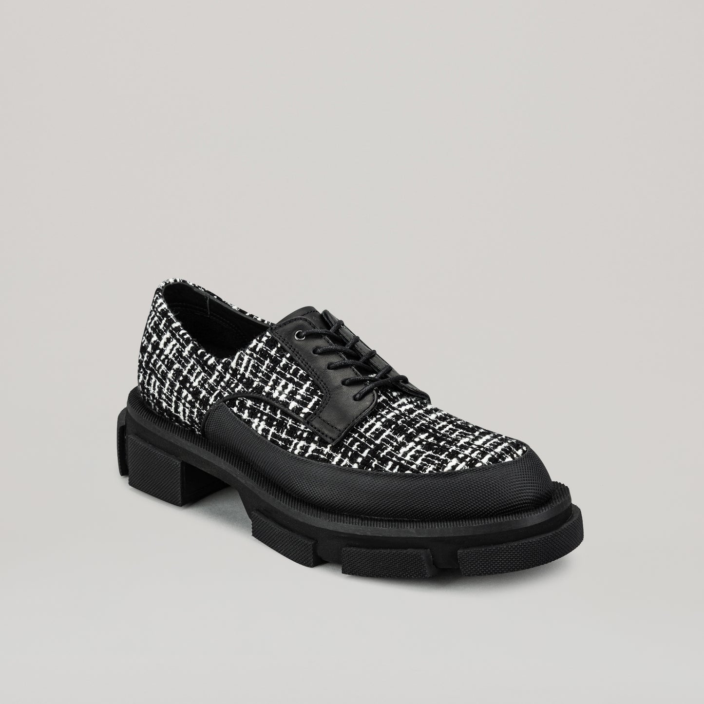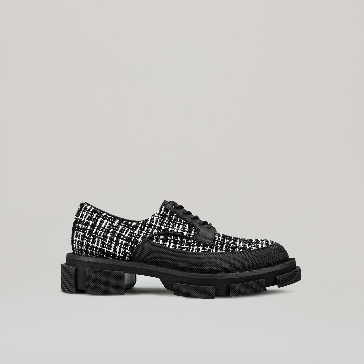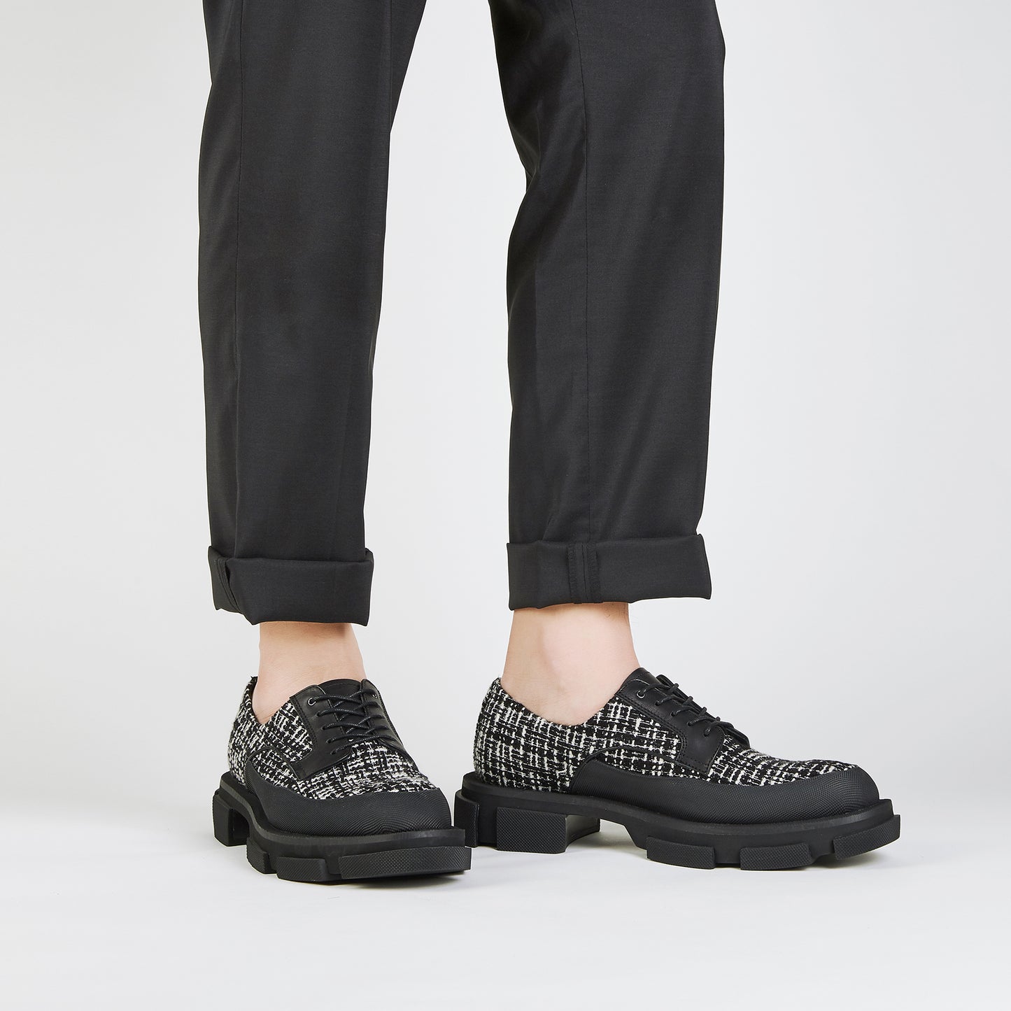Experience timeless style and comfort with the GAO DERBY-BLACK shoes. These derbies feature a signature design with tweed upper that offers a unique touch to any outfit. Crafted with quality and elegance in mind, these shoes are versatile and suitable for any occasion. Elevate your wardrobe and step out in confidence with both - GAO DERBY-BLACK.