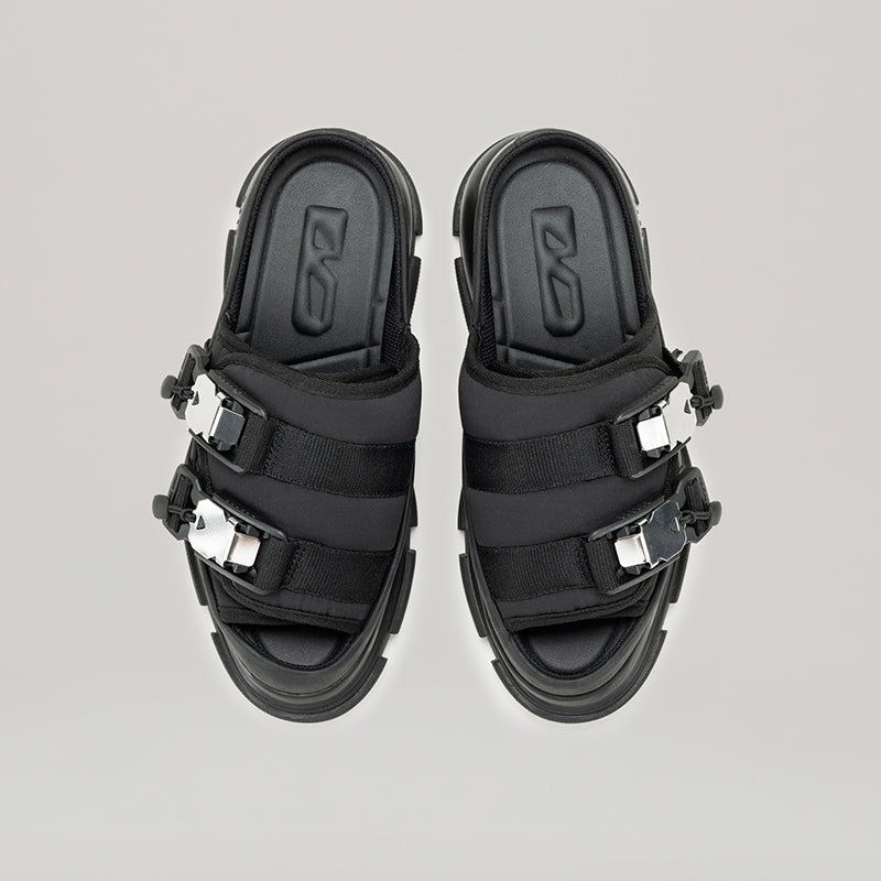 Elevate your style with both - GAO EVA Buckled Slides. These unisex slides feature a platform design and sleek silver buckles. Made with a combination of nylon and leather, these slides are durable and stylish. Upgrade your look with our black slides today.